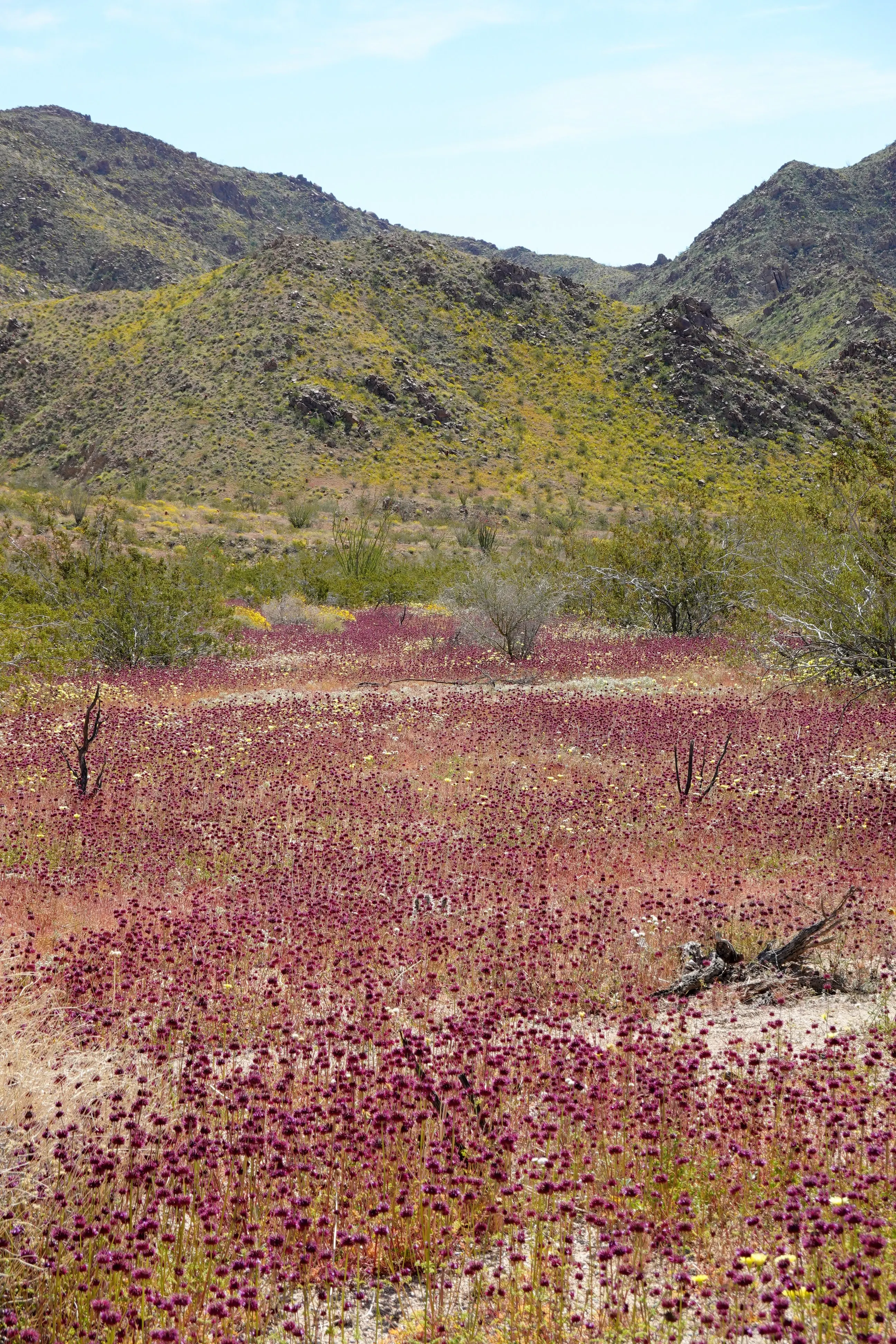 我們從南邊進入公園。雖然野花不像 2019 年那樣繁茂茂盛,但在約書亞樹國家公園標誌和棉白楊遊客中心之間,仍然可以看到許多美麗的花朵——比如罌粟花、沙漠風鈴草、黄杯花、沙漠蒲公英和沙漠針墊花。穿過遊客中心後,直到到達仙人掌花園,我們才看到一些花。