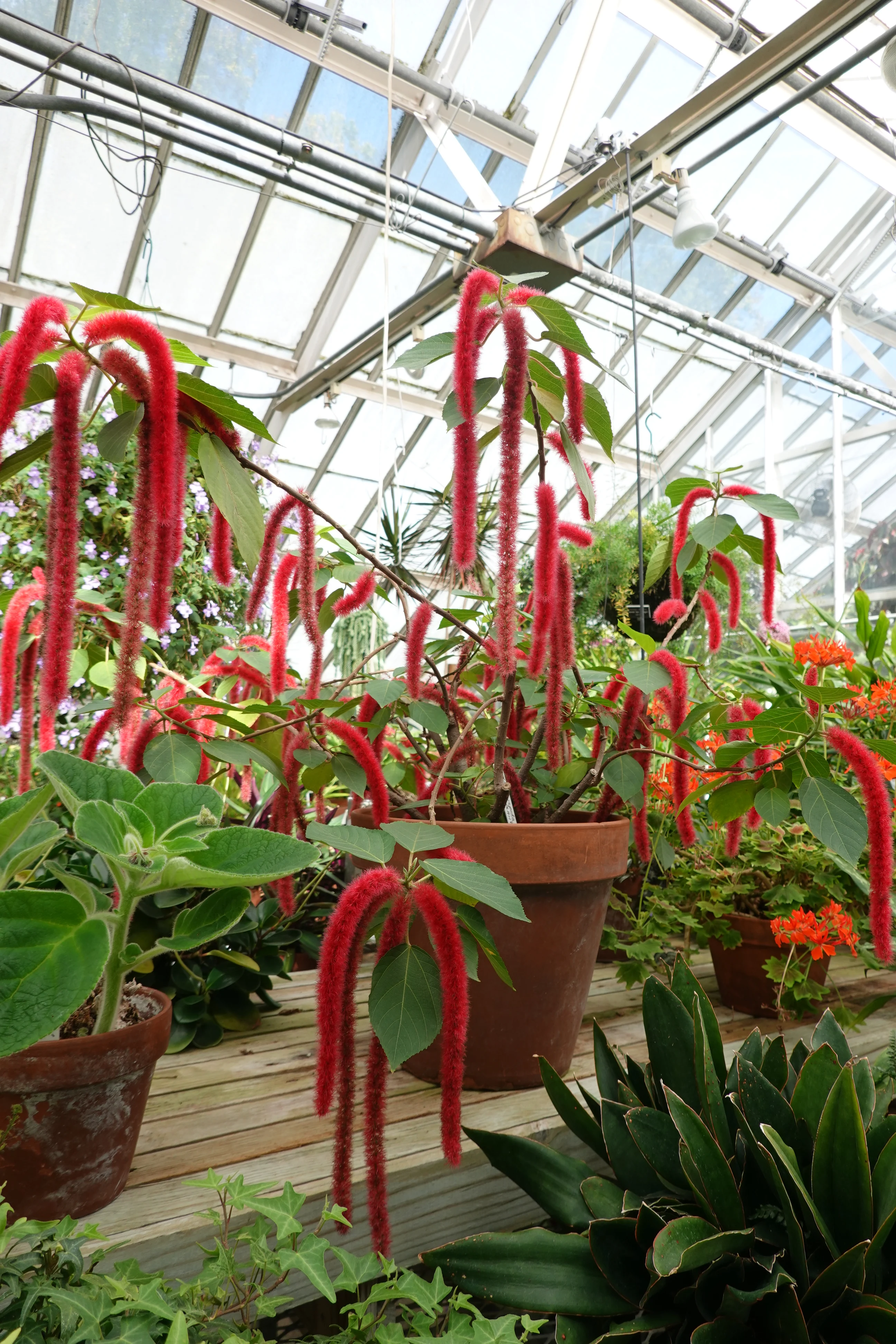 When I visited the Planting Fields Arboretum in New York, I saw some special plants. In one greenhouse, I saw several interesting plants with furry flowers, like several large caterpillars hanging on the branches. It makes me feel hairy and itchy. Because of its furry flowers, Acalypha hispida also gets several interesting common names such as Chenille plant, Philippine medusa, Red-hot Cat’s Tail, Foxtails and Monkey Tail.